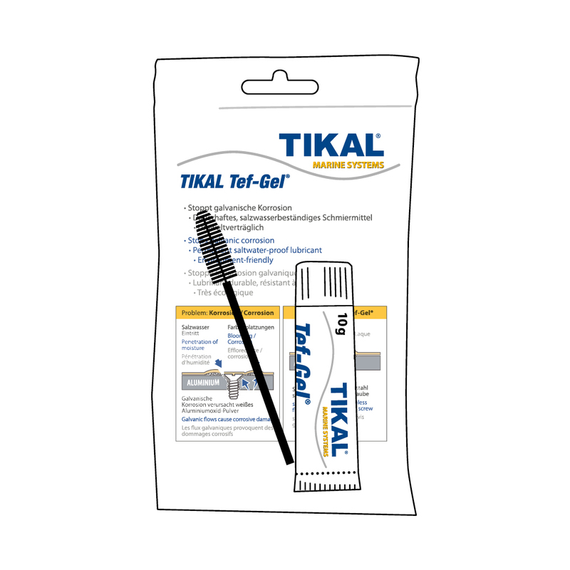 Setzen Sie Ihre Schrauben und Bolzen grundsätzlich mit Tikal Tef-Gel® ein und alles ist selbst nach intensivem Gebrauch in Seewasser wieder leicht zu lösen. Gleiches gilt auch gegen das Fressen bei Wantenspannern. Anwendung findet Tikal Tef-Gel® in der Bootsindustrie, im Automobil-, Luft- und Raumfahrtbereich und wo immer Teile vor Korrosion geschützt werden müssen.